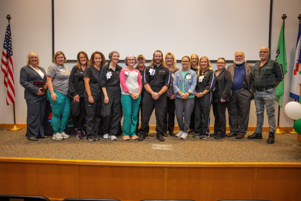 Past and present members of the PICU Transport Team at Hoops Family Children's Hospital pose for a photo at the 35th anniversary celebration, Thursday, Oct. 9, 2025.